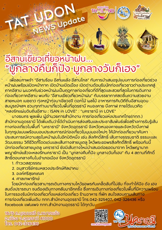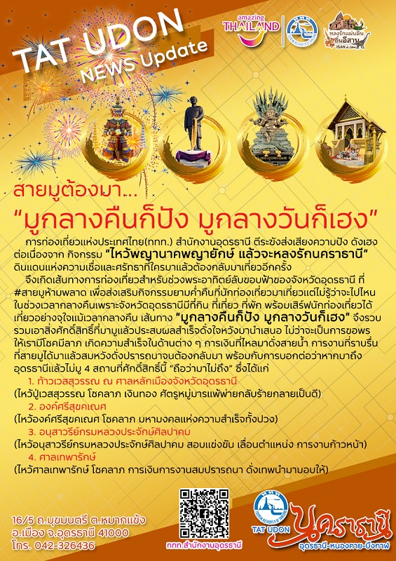 นางธนภร พูลเพิ่ม ผู้อำนวยการสำนักงาน การท่องเที่ยวแห่งประเทศไทย(ททท.) สำนักงานอุดรธานี ได้เพิ่มเติมว่าได้ดำเนินการส่งเสริมและประชาสัมพันธ์เพื่อสร้างการรับรู้เส้นทางท่องเที่ยวในพื้นที่ “นคราธานี” จังหวัดอุดรธานี จังหวัดหนองคายและจังหวัดบึงกาฬ ในทุกรูปแบบพร้อมมอบประสบการณ์ท่องเที่ยวในมุมมองใหม่ๆ ให้นักท่องเที่ยวมาค้นหาประสบการณ์ความสุขในหน้าฝนในอีกมิติหนึ่ง เช่น สิ่งศักดิ์สิทธิ์ เส้นทางธรรมชาติ ธรรมะและวัฒนธรรม วิถีชีวิตที่โดดเด่นและเส้นทางสายมูเตลู ไหว้พระขอพรสิ่งศักดิ์สิทธิ์ พร้อมกันนี้นักท่องเที่ยวสายมูเตลู นคราธานี ยังมีเส้นทางใหม่นำเสนอต่อยอดมาจาก ไหว้พญานาคพญายักษ์แล้วจะหลงรักนคราธานี เป็น “มูกลางคืนก็ปัง มูกลางวันก็เฮง” กับ 4 สถานที่ศักดิ์สิทธิ์ตอนกลางคืนในอำเภอเมือง จังหวัดอุดรธานี