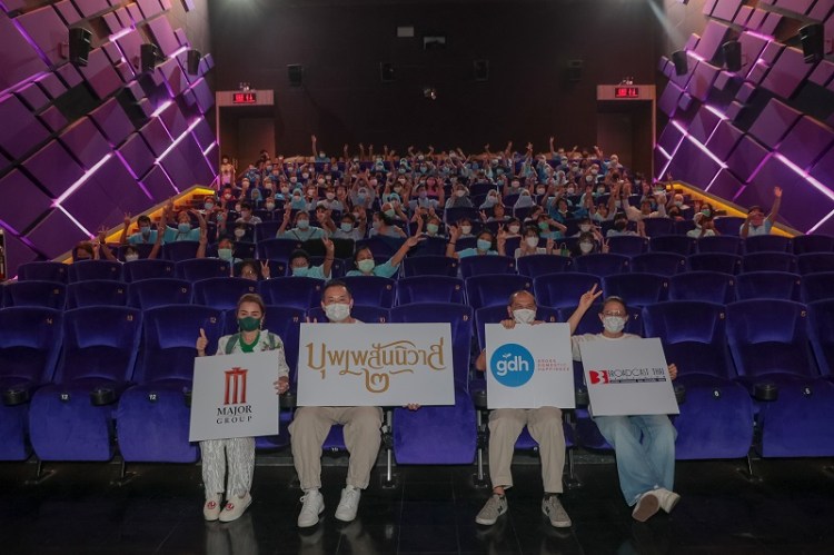 ซึ่งนอกจากนี้ยังร่วมบริจาคข้าวสาร อาหารแห้งให้กับ 6 ชุมชนรอบวัด ได้แก่ ชุมชนวัดประยูร, ชุมชนวัดกัลยาณ์, ชุมชนกุฎีจีน, ชุมชนกุฎีขาว, ชุมชนวัดบุพผาราม และชุมชนโรงคราม โดยมีผู้บริหาร จินา โอสถศิลป์, อรุโณชา ภาณุพันธุ์, อรรควุฒิ สุวรรณประกร, จิระ มะลิกุล, วรรณฤดี พงษ์สิทธิศักดิ์ ร่วมด้วยผู้กำกับ ปิ๊ง-อดิสรณ์ ตรีสิริเกษม และทีมนักแสดง โป๊ป-ธนวรรธน์ วรรธนะภูติ, ไอซ์-พาริส อินทรโกมาลย์สุต และ บ๊อบบี้-นิมิตร ลักษมีพงศ์ มาร่วมทำบุญ บริจาคทานในครั้งนี้ อีกทั้งทีมผู้บริหารได้เดินทางไปยังโรงภาพยนตร์ไอคอน ซีเนคอนิค ศูนย์การค้าไอคอน สยาม และโรงภาพยนตร์ เอส เอฟ เวิลด์ ซีเนม่า ศูนย์การค้าเซ็นทรัลเวิลด์ เพื่อเปิดฉายภาพยนตร์รอบพิเศษสำหรับผู้สูงอายุ, ผู้พิการ, ผู้ด้อยโอกาส และเยาวชน เพื่อชมภาพยนตร์ “บุพเพสันนิวาส ๒” ฟรี! จำนวน 1,000 ที่นั่ง เรียกว่าอิ่มทั้งใจได้ทั้งบุญ