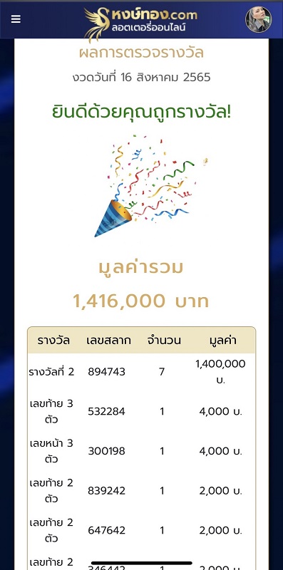 “หลังประกาศผลลอตเตอรี่ประจำวันที่ 16 สิงหาคม 2565 พี่สุเองก็ได้นำลอตเตอรี่ที่ตัวพี่สุได้ซื้อจาก หงษ์ทองลอตเตอรี่ออนไลน์ (หงษ์ทอง.com) มาเช็กผลดู ปรากฏว่าพี่สุถูกรางวัลถึง 13 ใบ ได้รับเงิน 1,416,000 บาท ความรู้สึกตอนที่รู้ตอนนั้น ถึงกับกรี๊ดลั่นบ้านเลยค่ะ กรี๊ดดังมากกก จนสามีตกใจ (หัวเราะ) บอกเลยค่ะดวงพี่สุถูกโฉลกกับหงษ์ทองลอตเตอรี่ ที่บริหารงานโดย CEO คนเก่งอย่าง คุณฐิตาภา ธนทรัพย์ปรีชาญ์ มาก ๆ เพราะตัวพี่สุเองได้ซื้อลอตเตอรี่จากที่นี่ทุกงวดมาสักระยะหนึ่งแล้ว ด้วยว่าง่ายสะดวกสบายกับตัวเรา โดยไม่ต้องออกไปลุ้นไปแย่งซื้อข้างนอกบ้าน เพียงแค่เข้าเว็บไซต์ หงษ์ทอง.com ก็ได้ลอตเตอรี่ที่มีตัวเลขในใจเราแล้วค่ะ ที่ผ่าน ๆ มาก็ไม่พลาด ฟาดไปไม่น้อยเลยค่ะ (หัวเราะ) บอกเลยว่าถูกทุกงวดจากที่นี่ จนมาถึงงวดนี้ ที่ถูกรางวัลรวมแล้วได้เงินก้อนใหญ่กว่าล้านสี่ จากใจเลยนะคะ ไม่ผิดหวังเลยค่ะ และสุดท้ายนี้พี่สุเองก็ขอแสดงความยินดีกับ 2 ท่านจาก จ.สมุทรปาราการ ที่ถูกรางวัลที่ 1 รวมถึง 12 ล้านบาท มา ณ โอกาสนี้ด้วยนะคะ รู้มาว่าทางหงษ์ทองฯ จะไปมอบรางวัลให้ถึงที่สมุทรปราการกันเลยทีเดียว ขอแสดงความยินดีด้วยค่ะ”