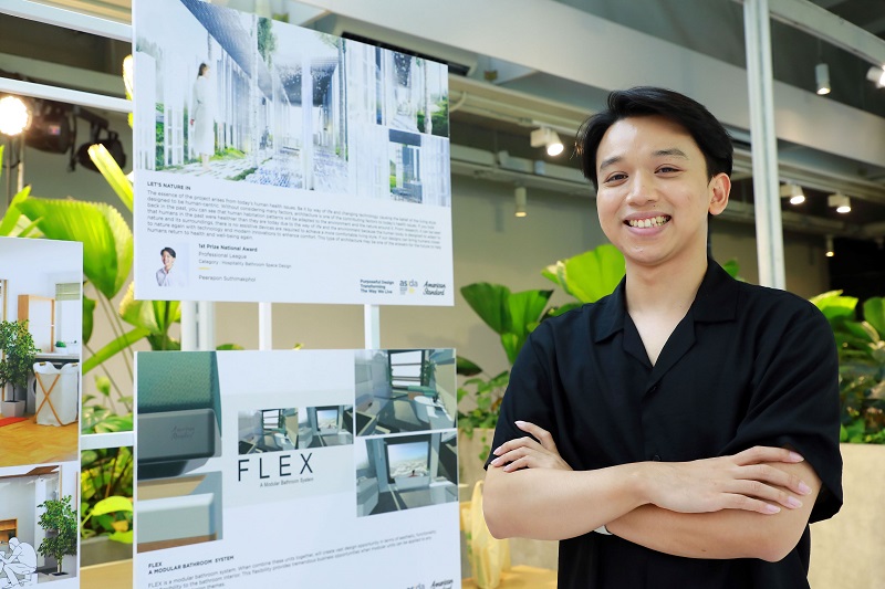 ส่วนรางวัลชนะเลิศด้านการออกแบบพื้นที่ใช้สอยในห้องน้ำของโรงแรม ได้แก่ คุณธีรเกียรติสุขอยู่ นักศึกษาคณะสถาปัตยกรรมศาสตร์ มหาวิทยาลัยอัสสัมชัญประเทศไทย ด้วยแนวคิดการออกแบบที่รวบรวมคุณสมบัติด้านสุขอนามัยที่ล้ำสมัยตั้งแต่พื้นผิวไปจนถึงผลิตภัณฑ์ เพื่อส่งมอบสุขอนามัยระดับสูงสุดโดยแทบไม่ต้องทำความสะอาด เพื่อประสบการณ์การเข้าพักที่ไร้กังวลอย่างแท้จริงสำหรับแขกของโรงแรม “รู้สึกภูมิใจมากที่ได้รับรางวัลชนะเลิศครับ การประกวดครั้งนี้มีความหมายต่อชีวิตผมในหลายด้าน โดยเฉพาะการได้เติมเต็มไอเดียและทำให้มีโอกาสได้พิสูจน์ตัวเองเพื่อยืนยันถึงแนวความคิดของเราว่ามีความเป็นไปได้และใช้งานได้จริง หัวใจหลักที่ผมใช้ในการออกแบบผลงาน คือ ในฐานะผู้ออกแบบเราไม่สามารถบังคับพฤติกรรมผู้ใช้ที่มีความต่างกันได้แต่เราสามารถสร้างพื้นที่ที่ผู้ใช้ใช้งานร่วมกันได้ หลังจากเรียนจบผมฝันอยากเป็นนักออกแบบที่สร้างสรรค์ผลงานที่เชื่อมโยงกับธรรมชาติและสิ่งแวดล้อมที่เป็นมิตรต่อโลก ประหยัดพลังงาน ตอบโจทย์ชีวิตผู้คน และเป็นพลังเล็ก ๆ ที่ได้ช่วยโลกให้น่าอยู่ขึ้นครับ” คุณธีรเกียรติ กล่าว