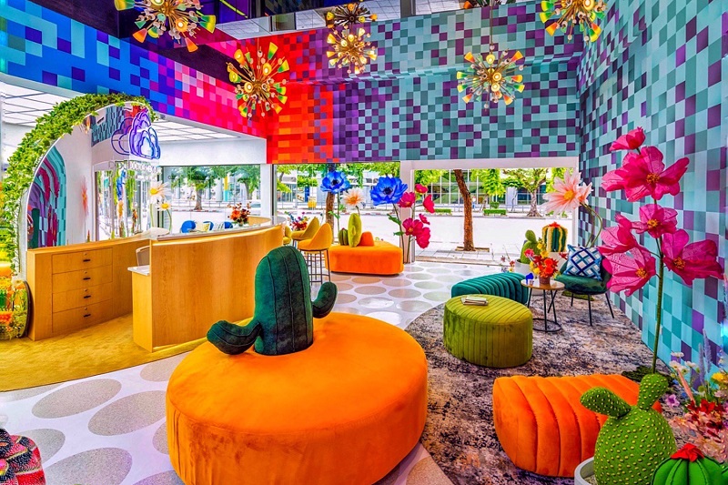 เปิดแต่ละโซนที่ล้วนมีความหมายและชวนให้ถ่ายรูปเช็คอินยิ่งกว่าคาเฟ่ เริ่มจากมุมแรก โซนต้อนรับด้านหน้าคลินิก ที่เรียกว่า “Colorful Pixel Wall” เป็นการออกแบบตกแต่งผนังที่สื่อถึงความละเอียดที่ใส่ใจในระดับรูขุมขน ในทุกครั้งที่ลงเข็มเปรียบเสมือนการซูมในโปรแกรมตกแต่งภาพที่ลึกลงไปในระดับพิกเซล โดยเพิ่มความสดใสให้กับคนไข้ที่เข้ามาที่คลินิกตั้งแต่ก้าวแรกที่เดินเข้ามาด้วย “สวนดอกไม้ Tropical Oasis”