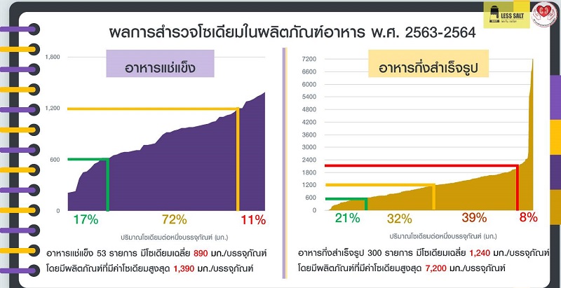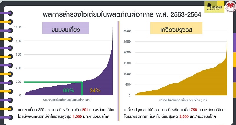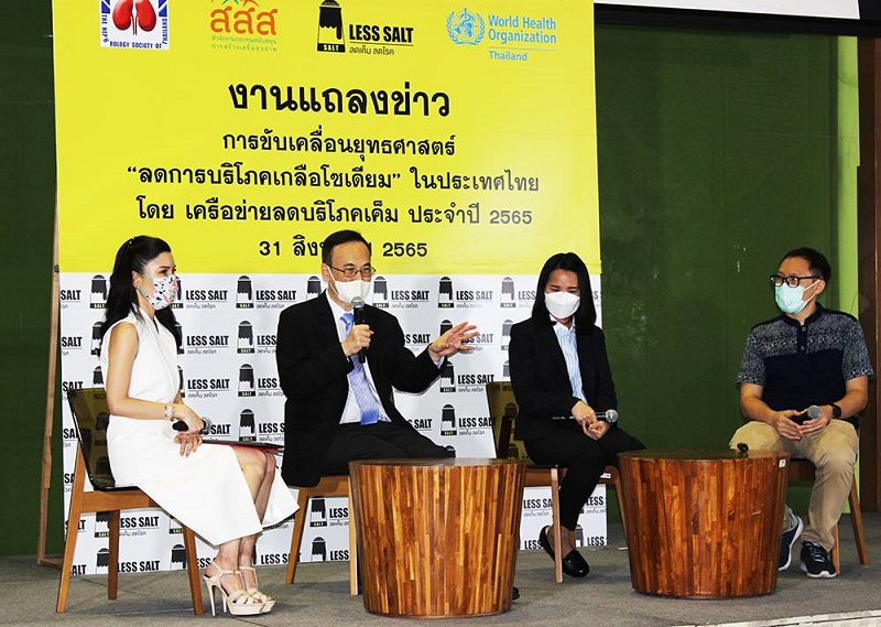 ด้าน รศ.นพ.สุรศักดิ์ กันตชูเวสศิริ ประธานเครือข่ายลดบริโภคเค็ม กล่าวว่า คนไทยกินเค็มเกินความต้องการของร่างกายถึงเกือบ 2 เท่า จึงเป็นสาเหตุของการเจ็บป่วยด้วยโรคไม่ติดต่อเรื้อรัง NCDs ที่สำคัญในช่วงระยะเวลา 2 ปีที่ผ่านมาเกิดวิกฤตการณ์แพร่กระจายของเชื้อไวรัสโควิด-19 ส่วนหนึ่งทำให้มีผู้คนมากมายติดเชื้อโควิด-19 โดยเฉพาะผู้สูงอายุและผู้ป่วยโรคไตที่อาการมากกว่าคนทั่วไป ในส่วนของการส่งเสริมกิจกรรมลดพฤติกรรมการบริโภคเค็มได้ดำเนินการในทุก ๆ ด้าน โดยผลการสำรวจโซเดียมในผลิตภัณฑ์อาหารในปี 2563-2564 ร่วมกับสมาคมเพื่อนโรคไต ได้มีการเก็บข้อมูลผลิตภัณฑ์อาหาร 4 กลุ่ม ประกอบด้วย 1. กลุ่มอาหารแช่แข็ง 53 รายการ มีโซเดียมเฉลี่ย 890 มิลลิกรัม/บรรจุภัณฑ์ มากกว่าคำแนะนำขององค์การอนามัยโลกที่กำหนดให้ปริมาณโซเดียมจากอาหารหลักควรได้รับไม่เกิน 600 มิลลิกรัม/มื้อ 2. กลุ่มอาหารกึ่งสำเร็จรูป 300 รายการ ได้แก่ บะหมี่ โจ๊กและซุปกึ่งสำเร็จรูป มีโซเดียมเฉลี่ย 1,240 มิลลิกรัม มากกว่า 2 เท่าของคำแนะนำขององค์อนามัยโลกที่กำหนดให้ปริมาณโซเดียมจากอาหารหลักควรได้รับไม่เกิน 600 มิลลิกรัม/มื้อ 3. กลุ่มขนมขบเคี้ยว 400 รายการ โดยแบ่งเป็นกลุ่มขนมขบเคี้ยวรสชาติเค็ม ได้แก่ มันฝรั่ง ข้าวเกรียบ ถั่ว สาหร่าย ปลาเส้น 320 รายการ มีค่าโซเดียมเฉลี่ย 201 มิลลิกรัมต่อหน่วยบริโภค ซึ่งมากกว่าคำแนะนำจากองค์การอนามัยโลกที่กำหนดให้ปริมาณโซเดียมจากอาหารระหว่างมื้อควรได้รับ ไม่เกิน 100 มิลลิกรัมต่อมื้อ และ 4. กลุ่มเครื่องปรุงรส 100 รายการ มีโซเดียมเฉลี่ย 758 มิลลิกรัมต่อหน่วยบริโภค และเมื่อนำผลการสำรวจมาเทียบเกณฑ์แนะนำของ WHO (sodium benchmark) พบว่า แม้ในแต่ละกลุ่มจะมีบางผลิตภัณฑ์ที่มีปริมาณโซเดียมผ่านเกณฑ์ แต่ค่าเฉลี่ยของโซเดียมในผลิตภัณฑ์อาหารแต่ละกลุ่มล้วนสูงกว่าเกณฑ์ดังกล่าวทั้งสิ้น