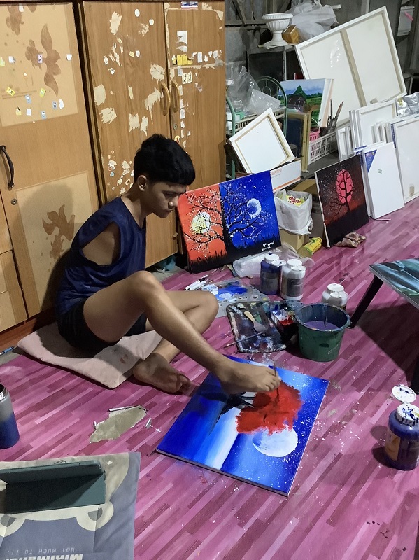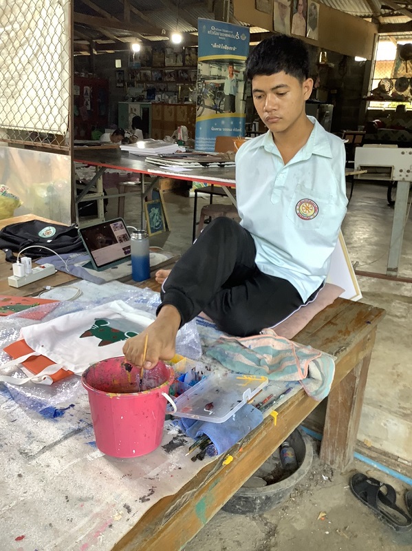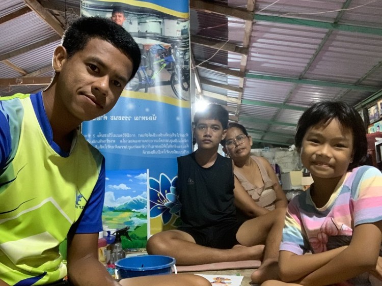 “สวัสดีครับ ชื่อนายวรรธณะ คำอินทร์ ชื่อเล่น “น้องทาม” ครับ ตอนนี้เรียนอยู่ชั้นมัธยมศึกษาปีที่ 6 โรงเรียนประชาสงเคราะห์วิทยา นอกจากวาดกระเป๋าผ้าแล้วผมก็มีวาดลงแผ่นเฟรม ราคาประมาณ 500 / 800 / 1,000 / 2,000 พอกลับจากโรงเรียนผมจะทำการบ้านก่อน แต่ถ้าวันไหนไม่มีก็วาดรูปลงกระเป๋าและแผ่นเฟรม คือทำงานต่อเลยครับ