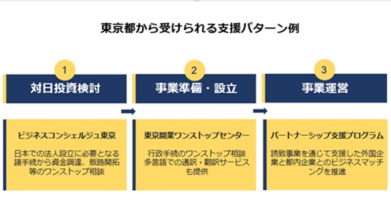 Tokyo One-Stop Business Establishment Center (TOSBEC) พร้อมให้คำปรึกษาเป็นรายบุคคลเกี่ยวกับขั้นตอนการจัดตั้งบริษัทแก่ธุรกิจต่างชาติหรือธุรกิจร่วมทุนโดยเจ้าหน้าที่ผู้เชี่ยวชาญ เพื่อให้สามารถดำเนินขั้นตอนต่าง ๆ สำหรับการจัดตั้งธุรกิจได้อย่างรวดเร็ว เช่นการรับรองหนังสือบริคณห์สนธิ, การแจ้งจดทะเบียนบริษัท, การจัดการด้านภาษี, การยื่นประกันสังคม และการจัดการด้านเอกสาร ตรวจคนเข้าเมือง ฯลฯ