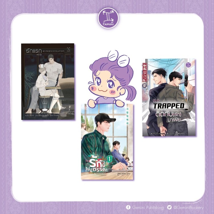 ในส่วนของ Gemini จะเป็นนิยายวายค่ะ ซึ่งเป็นนิยายชายรักชาย บรรณาธิการสำนักพิมพ์มีความชอบนิยายแนวนี้ เอาจริง ๆ นะคะ พี่เจมี่อยู่ในยุคนิยายวายใต้ดิน มันอัดอั้นมาตั้งแต่ตอนนั้น เวลาที่จะซื้อนิยายทีไปมุดหาร้านในสยาม เวลาเข้าไปซื้อมีการบอกโค้ดลับ555 ก็ได้เรื่องที่ตามหา แล้วการโปรโมตในสมัยนั้นเหมือนปากต่อปากเนอะ แล้วพอเราเริ่มอาวุโสขึ้น มีเงินทุนขึ้น ก็เออ…คิดว่านิยายวายก็ขึ้นบนดินได้ แล้วก็ทำให้มันดีได้ค่ะ แต่ก่อนต้องลับ ๆ ล่อ ๆ ซื้อไงคะ นิยายเกาหลีเรื่องแรกเป็นเรื่อง ”รักแรก” หรือ Hyperventilation จริง ๆ แล้วพี่เจมี่ชอบตัวอะนิเมชันก่อนแล้ว รักแรกเป็นนิยายที่ทำมาจากอะนิเมชันเกาหลีชื่อเรื่องเดียวกันค่ะ เขาได้มาเขียนเป็นนิยายอีกที ซึ่งเนื้อหามันจะเข้มข้นกว่ารายละเอียดเยอะกว่าอะนิเมชัน ก็เลยขอซื้อเรื่องนี้มาแปลเป็นไทย ดีเกินคาดมากค่ะ จริง ๆ นิยายเกาหลีหลายคนคิดว่าอ่านค่อนข้างยาก แต่รักแรก J.Soori ผู้เขียนที่ดัดแปลงมาจากอะนิเมชันสำนวนดีมาก เป็นคนรอบรู้ในเรื่องที่เขียน เขาหาข้อมูล เขาแน่นจริง ๆ เขารู้ทุกอย่าง เพราะในเรื่องตัวนายเอกเขาเป็นนักเล่นโกะ ก็คือหมากล้อม J.Soori ก็มีการบรรยายเปรียบเทียบกับหมากล้อมในเรื่อง นายเอกก็มีการคิดเป็นหมากล้อมกับพระเอกอะไรแบบเนี่ยค่ะ แล้วเรื่องที่ 2 เราก็ได้ผลงานของ J.Soori เรื่อง “รักนี้ไม่มีตรรกะ” เพราะเราประทับใจการเขียนของนักเขียนท่านนี้ ชื่อภาษาอังกฤษคือ Semantic Error เรื่องนี้จะ 3 เล่มจบนะคะ เล่มแรกออกแล้ว ส่วนเล่มที่ 2 ประมาณต้นเดือนพฤศจิกายนเปิดพรีออร์เดอร์ ส่วนเล่มที่ 3 ต้นมกราคมหรือกุมภาพันธ์ ปีหน้าและมี box set ด้วยนะคะ สำหรับตัวพระเอกของสนพ. คือเรื่อง “รักแรก” และ “รักนี้ไม่มีตรรกะ” แต่จริง ๆ เรื่องแรก ๆ ที่เราออกมาเลยคือเรื่อง “TRAPPED ติดกับ(รัก) มาเฟีย” ยอดวิวดีค่ะ ที่บอกว่าดีเพราะเรื่องนี้ได้รับการดัดแปลงเป็นละครทางไลน์ทีวีที่ไต้หวันค่ะ และได้เสียงตอบรับที่ดีมากในไต้หวัน เราเลยหยิบเรื่องนี้มาลงตลาดเป็นนิยายวาย ก็เป็นแนวมาเฟียกับตำรวจค่ะ ในเรื่องของปกนิยายเราก็จะมาพิจารณาอีกทีว่าเหมาะจะใช้ปกเดียวกับนิยายที่เราซื้อหรือจะวาดใหม่ เพราะแนวตลาดบ้านเราจะมีความชอบไม่เหมือนต่างประเทศ อย่างเช่นนิยายวายชอบรูปวาด เราก็จะจ้างวาดค่ะ แต่ถ้าปกเมืองนอกสวยอยู่แล้วแล้วคิดว่าตลาดบ้านเรามีฟีดแบ็คที่ดีเราก็จะซื้อปกต้นฉบับด้วยค่ะ