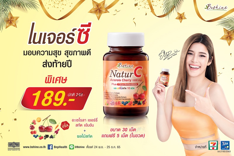 “บีไชน์ เนเจอร์ซี” ขนาดบรรจุ 30 เม็ด (แถมฟรีอีก 5 เม็ดในขวด) จัดโปรโมชั่นสุขคุ้มเวอร์ ส่งท้ายปี ลดราคาพิเศษ เหลือเพียง 189 บาท จากปกติ ราคา 249 บาท ตั้งแต่วันนี้ – 25 ธันวาคม 2565 หาซื้อได้ที่ร้านเซเว่น อีเลฟเว่น ทุกสาขาทั่วประเทศ สามารถดูข้อมูลเพิ่มเติมได้ที่ http://www.bshine.co.th, FB : https://www.facebook.com/BnpHealth และ Line : @Bshine