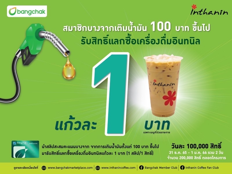 สมาชิกบางจากกรีนไมลส์รับสิทธิ์แลกซื้ออินทนิลเพียงแก้วละ 1 บาท 31 ธ.ค. 65 – 1 ม.ค. 66