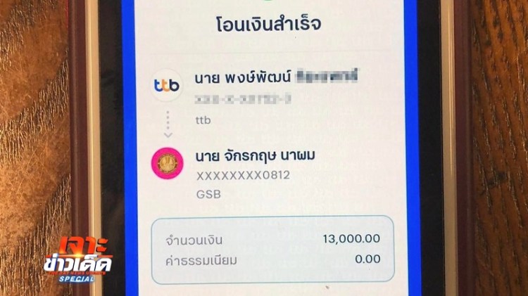 คุณอ๊อดผู้เสียหาย : คือผมเสร็จจากธุระข้างนอกแล้วผมก็เข้ามาในบ้านเอาโทรศัพท์วางไว้เพื่อจะไปกินข้าว แล้วก็หยิบโทรศัพท์มาดูหนัง เห็นข้อความของแอปพลิเคชันธนาคารว่ามียอดเงินจากผมโอนเข้าไปบัญชีนี้จำนวน 13,000 บาท ตกใจมากครับ พอโดนก็เข้าไปเช็คในแอปพลิเคชันธนาคาร เงินไม่เหลือครับ เหลือแค่ประมาณ 50 สตางค์