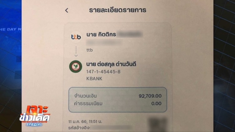 คุณซันผู้เสียหาย : 92,709 บาทครับ ผมรู้เมื่อตอนเกือบบ่ายสามโมงครึ่ง ผมเข้าไปในแอปพลิเคชันของธนาคาร เข้าไปดูมันจะมีอยู่ด้านล่างแอปพลิเคชันแจ้งว่าได้โอนเงินไป แล้วผมก็ตกใจครับตอนนั้น มารู้ว่าเป็นมิจฉาชีพตอนที่ว่าผมทักแชทไปถามรุ่นพี่กับเพื่อนครับว่าเงินผมได้โอนออกไปเองว่าโทรศัพท์โดนแฮ็ค รุ่นพี่ก็เลยไปหาข้อมูลของนายต่อสกุล ไปเจอในแบล็คลิสต์ครับ