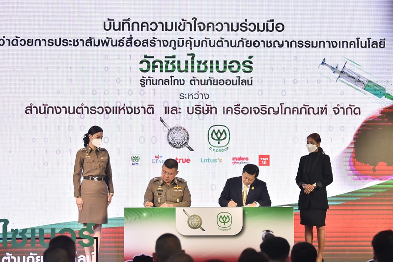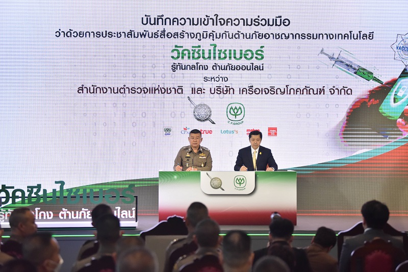 วันที่ 10 ก.พ.66 เวลา 14.30 น. พลตำรวจเอก ดำรงศักดิ์ กิตติประภัสร์ ผู้บัญชาการตำรวจแห่งชาติ และ คุณศุภชัย เจียรวนนท์ ประธานคณะผู้บริหาร บริษัท เครือเจริญโภคภัณฑ์ จำกัด ร่วมลงนาม ความร่วมมือการประชาสัมพันธ์สื่อ สร้างภูมิคุ้มกันต้านภัยอาชญากรรมทางเทคโนโลยี ระหว่าง สำนักงานตำรวจแห่งชาติ และ เครือเจริญโภคภัณฑ์ ผลิตสื่อไซเบอร์วัคซีน ร่วมสร้างความรู้ให้คนไทยเท่าทันกลโกงอาชญากรรมออนไลน์
