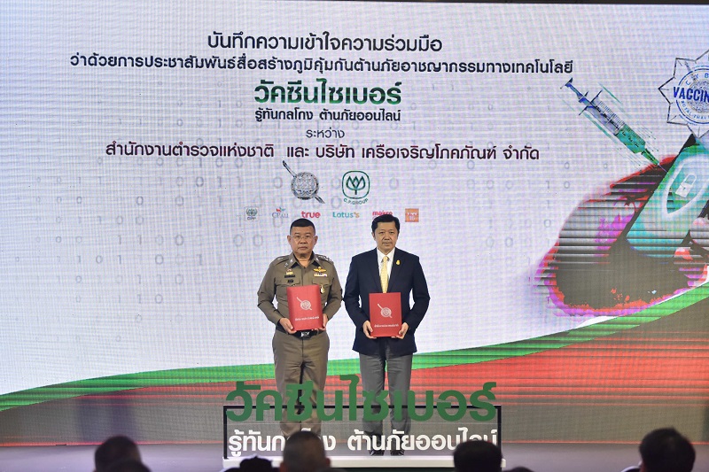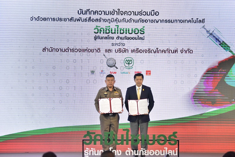 สำนักงานตำรวจแห่งชาติ จับมือเครือซีพี ลงนาม MOU ร่วมผลิตสื่อไซเบอร์วัคซีน ขยายช่องทางประชาสัมพันธ์ พร้อมดึงพิธีกรดัง ดารา ยูทูปเบอร์ ร่วมให้ความรู้เท่าทันโจร ไม่เป็นเหยื่อ ไม่ถูกโกง สร้างภูมิคุ้มกันคนไทยสู้ภัยอาชญากรรมออนไลน์ตามนโยบายรัฐบาล