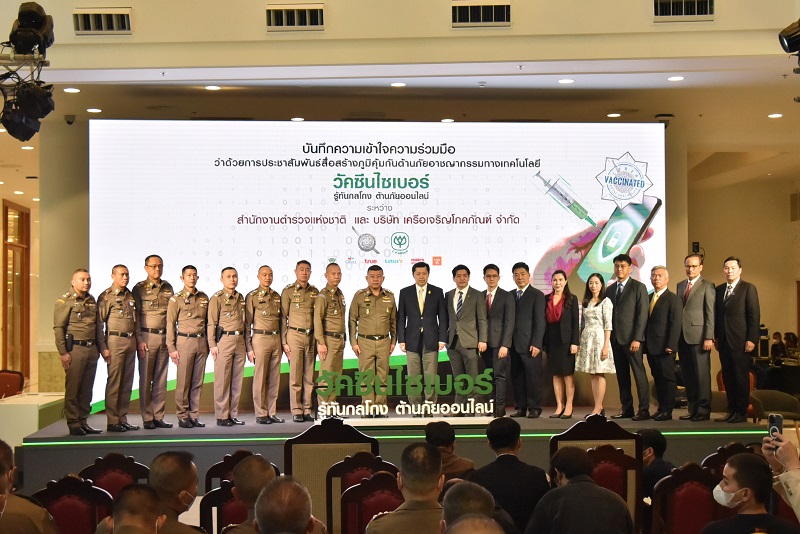 ด้านนายศุภชัย เจียรวนนท์ เปิดเผยว่า จากสถานการณ์ปัจจุบันที่อาชญากรรมไซเบอร์ได้พัฒนารูปแบบกลลวงอย่างหลากหลายและรุนแรงมากขึ้น จนกลายเป็นปัญหาความมั่นคงระดับชาติ เพราะส่งผลกระทบทั้งต่อการดำเนินชีวิตของคนไทย และความมั่นคงของประเทศ นอกจากนี้ในการประชุม World Economic Forum 2023 ได้จัดให้ ‘ภัยคุกคามไซเบอร์‘ เป็น 1 ใน 5 ความเสี่ยงที่สำคัญระดับโลก โดยมีการคาดการณ์ว่าผลกระทบจากการโจมตีทางไซเบอร์ จะสูงถึง 10.5 ล้านล้านเหรียญภายในปี 2025 นั้น เครือเจริญโภคภัณฑ์และกลุ่มบริษัทในเครือฯ ในฐานะของผู้นำธุรกิจภาคเอกชน จึงมีความยินดีเป็นอย่างยิ่งในการร่วมมือกับสำนักงานตำรวจแห่งชาติ นำร่องด้านการสื่อสารประชาสัมพันธ์สร้างการรับรู้เกี่ยวกับกลโกงต่างๆ ของอาชญากรรมไซเบอร์เป็นองค์กรแรก เพื่อสร้างภูมิคุ้มกันไซเบอร์วัคซีนให้ประชาชนชาวไทยมีความรู้เท่าทันอาชญากรรมทางเทคโนโลยีในรูปแบบต่างๆ ซึ่งการร่วมสร้างความตื่นรู้ให้สังคมไทยในครั้งนี้ สอดคล้องกับค่านิยม 3 ประโยชน์ที่เครือฯ ยึดมั่นในการตอบแทนบุญคุณแผ่นดิน สร้างประโยชน์ต่อประเทศชาติ และประชาชนเป็นสำคัญ