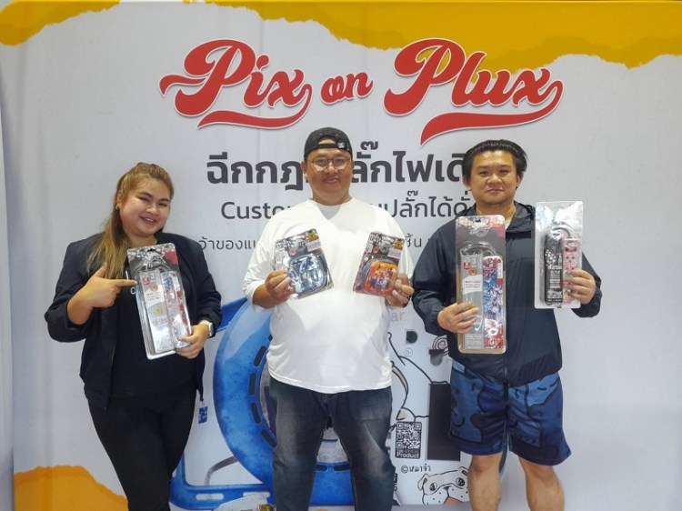 “ผมเป็นเจ้าของแบรนด์ Adsawin ซึ่งโรงงานเราเป็นโรงงานผลิตปลั๊กไฟได้รับมาตรฐาน มอก. อีกทั้งโรงงานได้ ISO และ มาตรฐาน Thailand Trust Mart ด้วย แต่พอดีช่วงโควิดเราประสบปัญหา เราก็ดิ้นรนหาผลิตภัณฑ์ใหม่เลยออกมาเป็น Pixonplux “ปลั๊กไฟที่ไม่ได้เป็นแค่…ปลั๊ก” จะเป็นการผสมผสานระหว่างปลั๊กไฟที่มีมาตรฐาน มอก.ผสมกับลวดลายของศิลปินทั่วประเทศนะครับ เราเปิดให้น้อง ๆ ส่งลวดลายเข้ามาแล้วลิขสิทธิ์พวกที่นำมาวางจำหน่ายก็เป็นของบริษัท น้องที่ส่งลวดลายเข้ามาบางคนก็มาจากงานเว็บไซต์ เฟซบุ๊ก บางคนก็เป็นงานลงเส้น ล่าสุดมหาวิทยาลัยศรีปทุมเพิ่งเชิญเราไปสัมมนา น้อง ๆ นักศึกษารู้ว่าเราเปิดรับก็ส่งลายกันเข้ามา ลวดลายที่เห็นในงานนี้มาจากศิลปินส่งเข้ามาแทบ 10 ลายที่เรานำมา เรียกได้ว่าเป็นลายที่น่าสนใจที่สุดแล้วครับ เราพยายามจะจับให้ได้หลาย ๆ กลุ่ม เพราะเราไม่รู้ว่าลูกค้ามาจากลุ่มไหนบ้าง เช่น ลายหมาแมวตลาดหมาแมวก็ใหญ่นะครับ อย่างปีนี้เป็นปีกระต่ายก็มีลายกระต่าย แล้วก็สายมูเตลูก็มี หรือลายโอตาคุก็เกี่ยวกับญี่ปุ่น ฯลฯ หลากหลายมากเลยครับ แต่ถ้าไม่ใช่ลายลิขสิทธิ์ที่ศิลปินวาดก็จะเป็นลายที่เราซื้อมาถูกต้องครับ”