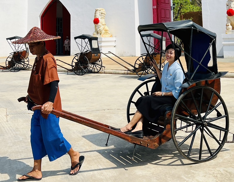 จุดที่ 1 ต้องซื้อบัตรเข้าชมกันก่อนครับ จุดนี้มีบริการแต่งกายย้อนยุคให้อยู่ในบรรยากาศของชาวสยามสมัยแผ่นดินล้นเกล้ารัชกาลที่ 5 พอแต่งตัวแล้วเสร็จก็มานั่งรถลากหรือรถเจ๊กแบบโบราณของชาวจีนในสมัยนั้น ไม่พลาดครับต้องถ่ายภาพชุดแต่งกายย้อนยุคราวกับเป็นคนในแผ่นดินรัชกาลที่ 5 ที่หน้าประตูทางเข้าเมืองมัลลิกากับรถเจ๊กสักรูปก่อนครับ