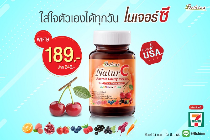 “บีไชน์ เนเจอร์ซี” ขนาดบรรจุ 30 เม็ด แถมฟรีอีก 5 เม็ดในขวด รวมเป็น 35 เม็ด จัดโปรโมชั่นสุดคุ้มลดราคาพิเศษ เหลือเพียง 189 บาท จากปกติ ราคา 249 บาท ตั้งแต่วันนี้ – 23 มีนาคม 2566 หาซื้อได้ที่ร้านเซเว่น อีเลฟเว่น ทุกสาขาทั่วประเทศ สามารถดูข้อมูลเพิ่มเติมได้ที่ www.bshine.co.th, FB : https://www.facebook.com/BnpHealth และ Line : @Bshine