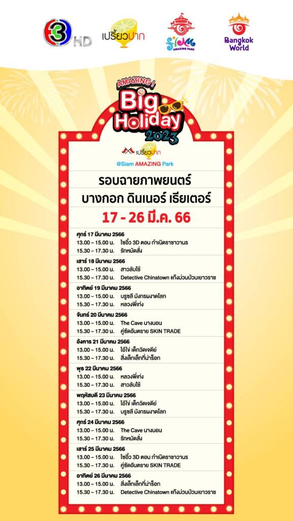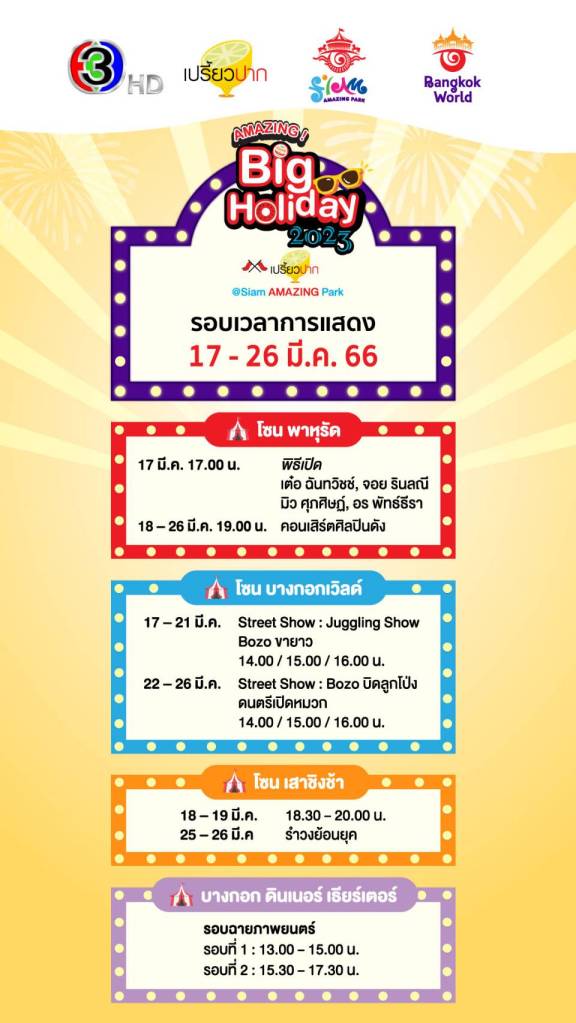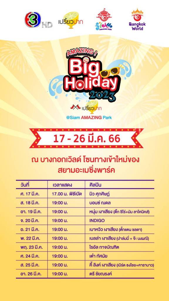 เปิดฉากด้วยไฮไลท์พิเศษสุดกับงาน Amazing Big Holiday X เปรี้ยวปาก @ Siam Amazing Park 17 – 26 มีนาคมนี้ 11.00-21.00 น. อร่อยฟินกับร้านเด็ดร้านดังกว่า 200 ร้านค้า สนุกกับกิจกรรมมากมายในบรรยากาศงานวัดกรุงเทพย้อนยุค ทั้งซุ้มเกมงานวัด รำวง สตรีทโชว์ สอยดาว ดูหนัง พบกับ 2 พิธีกรคู่ซี้ เต๋อ ฉันวิทชช์-จอย รินลณี และคอนเสิร์ตศิลปินดัง นำทีมโดย มิว ศุภศิษฏ์ อินดิโก้ ไรอัล กาจบัณฑิต เต๋า ทัศนัย บอนซ์ ณดล เจ้าของเพลงฮิตฉลามชอบงับคุณ และน่ารักชิปปุ๋ง งานนี้เที่ยวฟรี!!