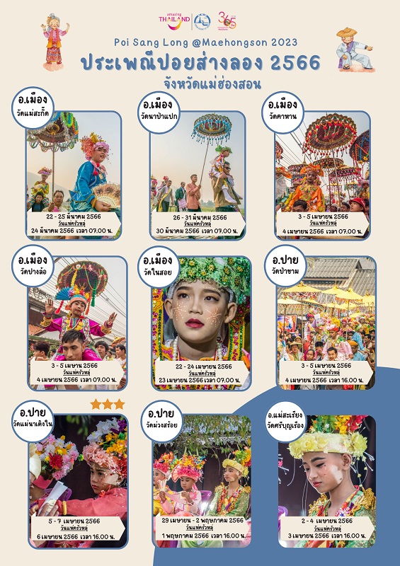 โดยมีกำหนดจัดงานประเพณีปอยส่างลองในพื้นที่ต่างๆ ของจังหวัดแม่ฮ่องสอนดังนี้