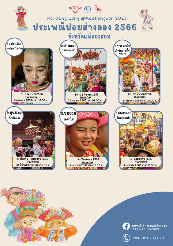 การท่องเที่ยวแห่งประเทศไทย (ททท.) สำนักงานแม่ฮ่องสอน ขอเชิญนักท่องเที่ยวทั่วประเทศมาร่วมชื่นชมความสวยงามของวัฒนธรรมชาวไทยใหญ่และขบวนแห่ส่างลองอันยิ่งใหญ่ตระการตาในงานประเพณีปอยส่างลอง ประจำปี 2566 ณ จังหวัดแม่ฮ่องสอน สอบถามรายละเอียดเพิ่มเติมได้ที่ ททท.สำนักงานแม่ฮ่องสอน เลขที่ 4 ถนนราชธรรมพิทักษ์ ตำบลจองคำ อำเภอเมืองแม่ฮ่องสอน จังหวัดแม่ฮ่องสอน 58000 โทรศัพท์ 0 5361 2982 – 3 โทรสาร 0 5361 2984 ในวันเวลาราชการ อีเมล์ tatmhs@tat.or.th Facebook : ททท.สำนักงานแม่ฮ่องสอน (TAT Maehongson)