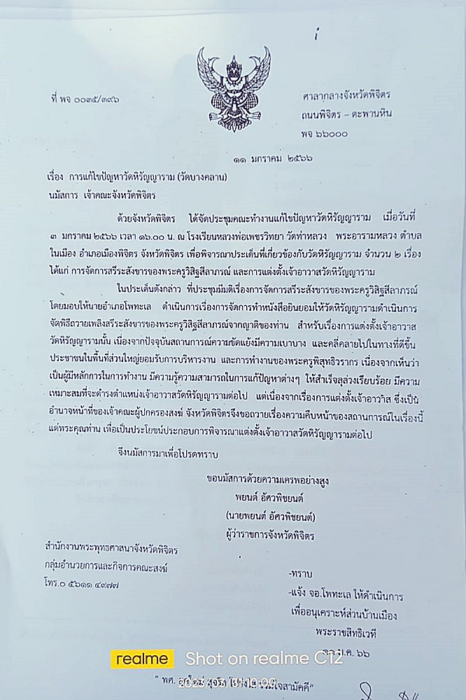 โดยระบุว่า เนื่องจากปัจจุบันสถานการณ์ความขัดแย้งมีความเบาบางและคลี่คลายไปในทางที่ดีขึ้นประชาชนในพื้นที่ส่วนใหญ่ยอมรับการบริหารงานและการทำงานของพระครูพิสุทธิวรากร ซึ่งความเป็นจริง ชาวบ้านไม่ยอมรับเพราะมีการแจ้งความดำเนินคดีกับชาวบ้านเป็นร้อยคดี พยายามให้ชาวบ้านติดคุก และเจ้าคณะจังหวัดพิจิตร อ้างเหตุผลแจ้งเจ้าคณะอำเภอโพทะเลว่าเพื่อสนองนโยบายผู้ว่าราชการจังหวัดพิจิตร และมีคลิปเสียงพระผู้ใหญ่ของจังหวัดโทรศัพท์ข่มขู่ให้พระครูวิรุฬธรรมาภิรัติ เจ้าคณะอำเภอโพทะเล ให้ดำเนินการแต่งตั้งพระครูพิสุทธิวรากร เป็นเจ้าอาวาสวัดหิรัญญาราม โดยปฏิบัติตามหนังสือจังหวัดพิจิตร มีเจ้าคณะตำบลท่านั่ง – บางคลาน มาคอยกำกับ กดดันเจ้าคณะอำเภอโพทะเล ลงนามในหนังสือรายงานการประชุม ทั้งๆที่ไม่ได้ประชุมจริง เสนอแต่งตั้งเจ้าอาวาสวัดบางคลาน และมีการแต่งตั้งให้เป็นเจ้าอาวาสเมื่อวันที่ 10 มีนาคม 2566 โดยชาวบ้านในตำบลบางคลานไม่มีใครทราบเรื่องและชาวบ้านในตำบลบางคลานไม่ยอมรับการแต่งตั้งพระครูพิสุทธิวรากร เป็นเจ้าอาวาส ขอให้เปลี่ยนตัวเจ้าอาวาส