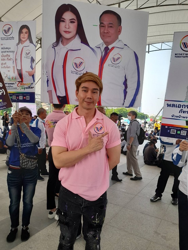 “ทีแรกรู้จักกับผู้ใหญ่ในพรรครวมแผ่นดิน มาดามหยก (กชพร เวโรจน์) ประธานที่ปรึกษาพรรค ก็รู้จักกันมานานแล้วฮะ ท่านประธานก็อยากจะให้เข้ามาทำอยู่เบื้องหลังเกี่ยวกับเรื่องสเตจเวที คอนเซ็ปต์พรรค และเป็นการ Change Together Team ขึ้นมา ที่เห็น ๆ พรรคผมมีนักแสดงหรือศิลปินเข้ามาเยอะเนี่ย ก็มีการดึงศิลปินเข้ามาเพื่อเป็นการสร้างสีสันและถือเป็นองค์กรหนึ่ง ไม่ว่าหลังเลือกตั้งองค์กร Change Together Team ยังอยู่ เพื่อดูแลความเป็นอยู่ของพี่น้องประชาชน เช่น มีการร้องเรียก เป็นองค์กรหนึ่งที่ช่วยงานสังคมครับ จากที่เราตั้งพรรคมากระแสตอบรับดี เราลงพื้นที่ด้วยครับ เราจะมีทีมรับฟังปัญหา แต่ส่วนทีม Change พอชาวบ้านเขาเห็นเขาก็ดีใจแล้ววิ่งเข้ามาถ่ายรูป จะมาถามเรื่องงานบันเทิง แต่ผมก็บอกว่าถ้ามีปัญหาอะไรให้บอกกล่าวกับทีมงานของเราได้ เพื่อจะได้เก็บข้อมูลเล่านี้มาช่วยเหลือหรือแก้ไขครับ ”