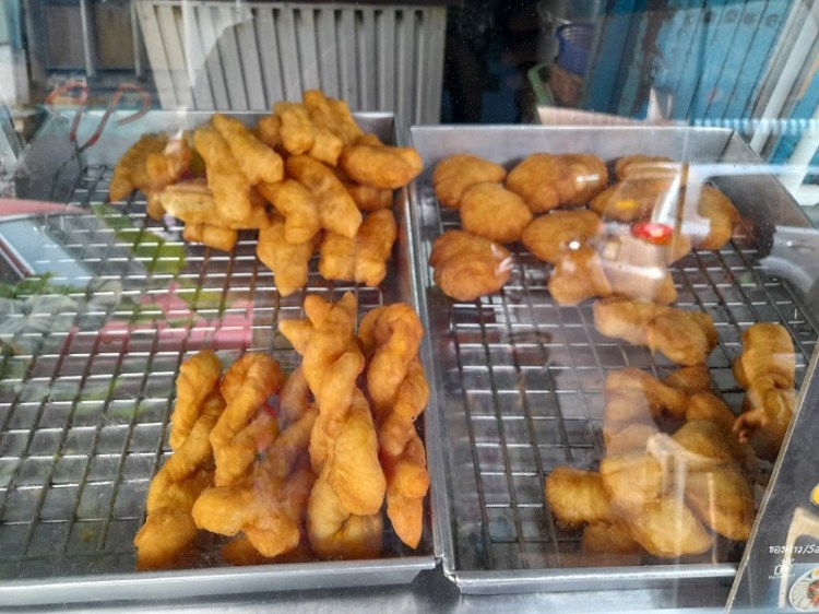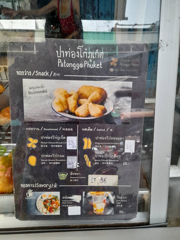 “ลูกค้าบางคนก็จะชอบหวาน หวานนี่คือสี่ขาของภูเก็ต ซาลาเปาหวาน ๆ เค็ม ๆ แล้วก็ปาท่องโก๋ธรรมดาเป็นคู่ แล้วก็แบบเกลียวเนี่ย ผมไม่ได้ทำขายนะ คือผมทำกินเอง เหลือเศษแป้งหน่อยนึงผมก็ม้วน ๆ กะทำกินเอง พอลูกค้าเขาเห็นเขาขอซื้อ ตอนนี้ที่ร้านมีปาท่องโก๋ 4 แบบ คือ สี่ขาของภูเก็ต, ซาลาเปา, แล้วปาท่องโก๋ธรรมดาเป็นคู่ และแบบเกลียว พระเอกในร้านเป็นปาท่องโก๋ของภูเก็ต ผมเป็นคนภูเก็ต