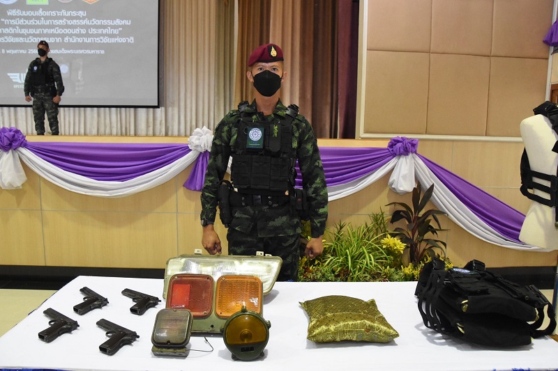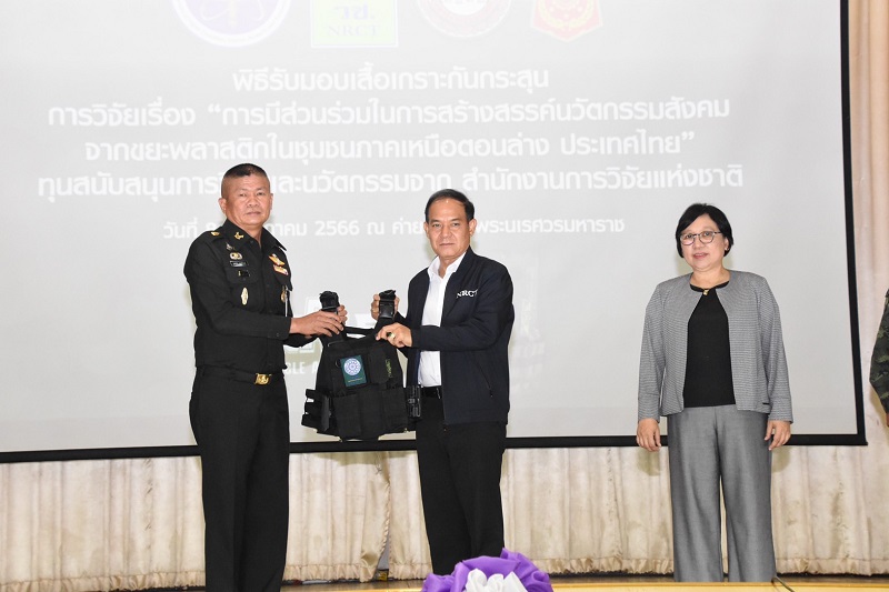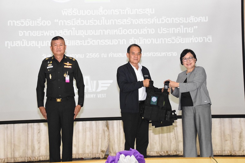 วันที่ 8 พฤษภาคม 2566 สำนักงานการวิจัยแห่งชาติ (วช.) กระทรวงการอุดมศึกษา วิทยาศาสตร์ วิจัยและนวัตกรรม ร่วมกับ กองทัพภาคที่ 3 และ มหาวิทยาลัยนเรศวร จัดพิธีส่งมอบนวัตกรรมเสื้อเกราะกันกระสุนจากขยะพลาสติก ซึ่งเป็นผลงานภายใต้โครงการวิจัยเรื่อง “การมีส่วนร่วมในการสร้างสรรค์นวัตกรรมสังคมจากขยะพลาสติกในชุมชนภาคเหนือตอนล่าง ประเทศไทย” ที่ วช. ให้ทุนสนับสนุนแก่ รองศาสตราจารย์ ดร.พนิดา จงสุขสมสกุล แห่งคณะบริหารธุรกิจ เศรษฐศาสตร์และการสื่อสาร มหาวิทยาลัยนเรศวร ดำเนินโครงการฯ โดย ดร.วิภารัตน์ ดีอ่อง ผู้อำนวยการสำนักงานการวิจัยแห่งชาติ ได้มอบหมายให้ นายเอนก บำรุงกิจ รองผู้อำนวยการสำนักงานการวิจัยแห่งชาติ เป็นผู้ส่งมอบนวัตกรรมดังกล่าว แก่กองทัพภาคที่ 3 โดยมี พลตรี ประสาน แสงศิริรักษ์ รองแม่ทัพภาคที่ 3 เป็นผู้รับมอบ พร้อมนี้ ศาสตราจารย์ ดร.กรกนก อิงคนินันท์ รองอธิการบดีฝ่ายพัฒนางานวิจัยและนวัตกรรม มหาวิทยาลัยนเรศวร พร้อมด้วยคณะนักวิจัย ให้การต้อนรับ ณ สโมสรบันเทิงทัพ ค่ายสมเด็จพระนเรศวรมหาราช จังหวัดพิษณุโลก