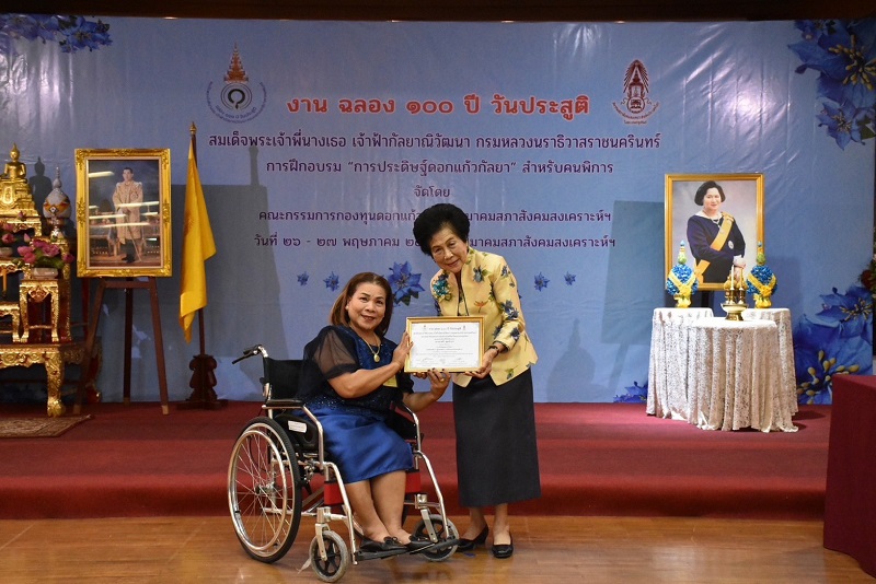 สมาคมสภาสังคมสงเคราะห์แห่งประเทศไทย ในพระบรมราชูปถัมภ์ จัดการฝึกอบรม “การประดิษฐ์ดอกแก้วกัลยา” สําหรับคนพิการ ผู้ดูแลคนพิการ และคนในครอบครัวของคนพิการ เนื่องในวาระครบรอบ 100 ปี วันประสูติสมเด็จพระเจ้าพี่นางเธอ เจ้าฟ้ากัลยาณิวัฒนา กรมหลวงนราธิวาสราชนครินทร์ ระหว่างวันที่ 26- 27 พฤษภาคม 2566 ณ ห้องประชุมชั้น 3 ตึกนวมหาราช สมาคมสภาสังคมสงเคราะห์ฯ โดยมี แพทย์หญิงสุวณี รักธรรม รองประธานสมาคมสภาสังคมสงเคราะห์ฯ เป็นประธานในพิธีเปิด เพื่อน้อมรําลึกในพระมหากรุณาธิคุณ และสืบสานพระเจตนารมณ์ที่ทรงต้องการให้ดอกแก้วกัลยา เป็นที่รู้จักอย่างทั่วถึง และได้รับการสนับสนุนอย่างเพียงพอที่จะช่วยเหลือคนพิการ ซึ่งเป็นการฝึกอบรมวิชาชีพระยะสั้นให้คนพิการได้รับความรู้และมีความสามารถในการประดิษฐ์ดอกแก้วกัลยา เพื่อสร้างเครือข่ายคนพิการในการจัดทํา “ดอกแก้วกัลยา” โดยเน้นการผลิตให้มีคุณภาพ และมาตรฐานเดียวกันให้คนพิการที่ได้รับการฝึกอบรมแล้วมีอาชีพเลี้ยงตนเอง และครอบครัวได้