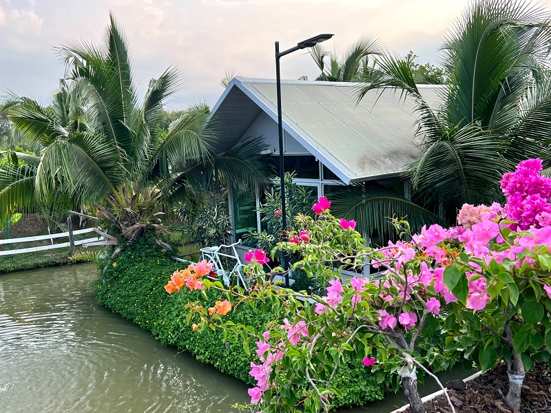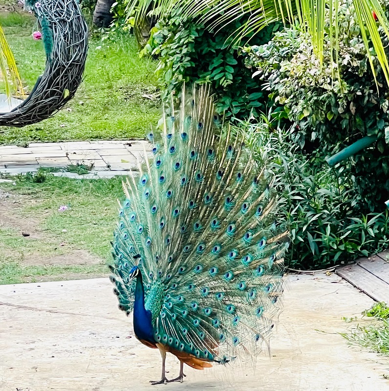 จุดที่ 2 ปั่นจักรยานเข้าสวนมะพร้าวน้ำหอม ร่มรื่น ท่องเที่ยวสนุกสุขใจพอจะข้ามสะพานหยุดถ่ายภาพวิวทิวสวนมะพร้าว ในลำธารมีน้ำตก มีสวนมะพร้าวแล้วก็พันธุ์กล้วยหอมกล้วยน้ำว้า แต่ที่สำคัญพลาดไม่ได้คือคอยแอบซุ่มดูนกยูงรำแพนให้ดี จังหวะดีมีโชว์นกยูงรำแพนให้ชมตื่นตาตื่นใจมากๆ สวยมากครับ นกยูงรำแพนนิ่งนานพอที่จะให้เราเก็บภาพจนจุใจ นกยูงที่สวนลุงหมงนี่มีหลายตัวเขาเลี้ยงไว้แบบธรรมชาติ มันก็เลยเชื่องกับคน เดินกรีดกรายรำแพนอวดให้คนอิจฉาเล่นๆ เด็กๆ เห็นก็ทำตาโตตกใจสตัํนไปแป๊บหนึ่ง คนหนุ่มคนสาวเห็นเข้าก็รู้ว่ายูงรำแพนแปลว่ายูงตัวผู้ที่รำแพนน่ะกำลังอวดความสง่างามเกี้ยวพาราสียูงตัวเมีย ได้เรียนรู้เรื่องราวของชีวิตสัตว์อย่างนกยูงแบบนี้ไปด้วยพร้อมๆ กับเข้าใจแล้วว่าธรรมชาติเป็นสิ่งยากที่มนุษย์เราจะลอกเลียนแบบได้