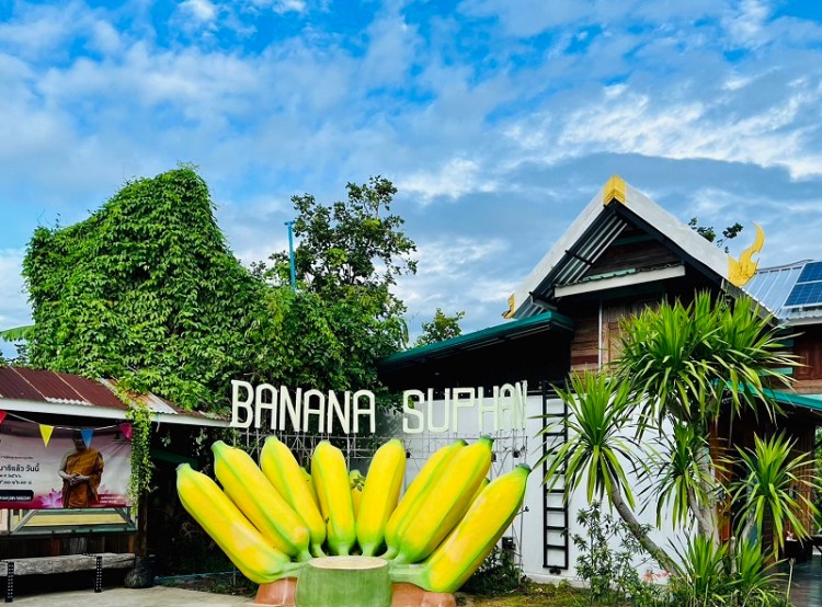 ส่วนด้านหลังวัดป่าเลไลยก์มีเกาะกลางน้ำหรือเรียกว่า “สวนกล้วยสุพรรณบุรี” มีพันธุ์กล้วยปลูกไว้มากจริง ๆ เพื่อการเรียนรู้เรื่องราวเกษตรโดยทุกวันเสาร์และวันอาทิตย์ตั้งแต่เวลา 06.30 น. มีพระภิกษุสงฆ์นั่งเรือพายมาเพื่อรับการใส่บาตรของญาติโยมทั้งหลายบริเวณท่าริมน้ำส่วนกล้วย เป็นภาพบรรยากาศริมน้ำสวยงามมากครับขอบอกน่าสนใจไปทำบุญตักบาตรพระสงฆ์มีเฉพาะวันเสาร์และวันอาทิตย์นะครับ