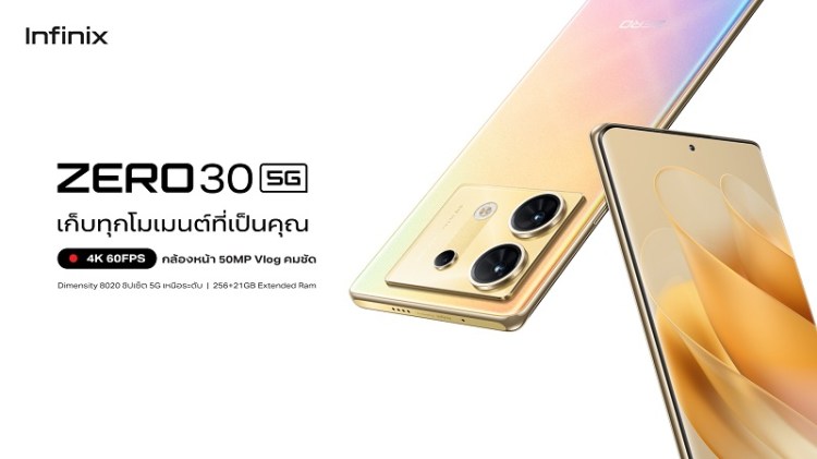 Infinix ZERO 30 5G มาพร้อมดีไซน์สวยล้ำทันสมัย พกพาสะดวก จับถนัดมือ เน้นจับกลุ่มคนหนุ่มสาวที่มีไลฟ์สไตล์ชื่นชอบการถ่ายภาพและเหล่าครีเอเตอร์สาย Vlog สำหรับรุ่นนี้จะเป็นสมาร์ตโฟนรุ่นแรกของแบรนด์ที่รองรับการถ่ายวิดีโอกล้องหน้าความละเอียดสูงสุดถึง 4K 60FPS พร้อมมีระบบกันสั่นแบบ OIS ความละเอียด 50 ล้านพิกเซล ซึ่งการันตีว่าสามารถจับทุกรายละเอียดของภาพในทุกมุมมองได้แบบมือโปร และเสริมประสิทธิภาพการใช้งานที่ยอดเยี่ยม ลื่นไหลด้วยชิปเซ็ต MediaTek Dimensity 8020 พร้อมจัดเต็มด้วยหน่วยพื้นที่ความจำ 256GB กับแรม 12GB โดยรุ่นนี้ได้ร่วมมือกับทาง Italian Pavilion เมืองเวนิส จัดงานเสวนาในคอนเซปต์ “New Image, New Lifestile | Cinema in the New Media, Capture Your Own Story” พร้อมยังเปิดตัวในงานเทศกาลภาพยนตร์นานาชาติเวนิส ณ ประเทศอิตาลี เพื่อสร้างสรรค์เรื่องราวสุดประทับใจที่สะท้อนให้เห็นผ่านมุมมองในระดับโลกอีกด้วย