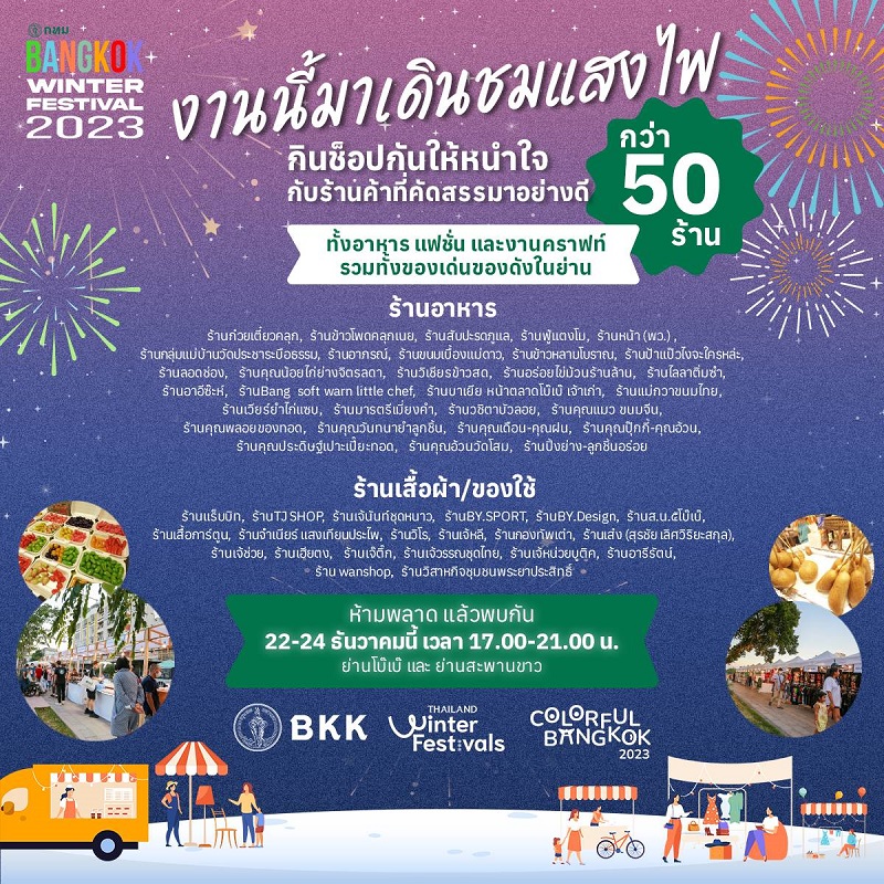 กินช็อปสนุกถูกใจในงาน Bangkok Winter Festival งานฤดูหนาวส่งท้ายปี 2023 วันที่ 22-23-24 ธ.ค. นี้ ย่านโบ๊เบ๊และย่านสะพานขาว &อ่านเพิ่มเติม “กินช็อปสนุกถูกใจในงาน Bangkok Winter Festival งานฤดูหนาวส่งท้ายปี 2023 วันที่ 22-23-24 ธ.ค. นี้ ย่านโบ๊เบ๊และย่านสะพานขาว”