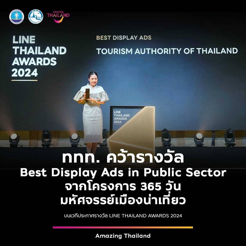 เพื่อค้นหาและมอบรางวัลให้แก่แบรนด์และองค์กรขนาดใหญ่ สำหรับแคมเปญที่เป็นเลิศ ประจำปี 2024 LINE THAILAND จึงได้จัดงานประกาศรางวัล LINE THAILAND AWARDS 2024 ขึ้น โดยในปีนี้การท่องเที่ยวแห่งประเทศไทย (ททท.) ซึ่งมีแคมเปญร่วมกับ LINE มาอย่างต่อเนื่อง ได้รับรางวัลในสาขา Best Display Ads in Public Sector จากการร่วมแคมเปญในโครงการ 365 วันมหัศจรรย์เมืองน่าเที่ยว ซึ่งเป็นโครงการที่สนับสนุนการท่องเที่ยวในพื้นที่เมืองรอง หรือเมืองน่าเที่ยว ผ่านรูปแบบ Event Hub บน LINE SHOPPING ซึ่งเป็นช่องทาง E-commerce ที่ได้รับความนิยม เพื่อให้นักท่องเที่ยวได้เลือกซื้อ Voucher ด้านการท่องเที่ยวในราคาพิเศษ ก่อให้เกิดการเดินทางผ่านโครงการถึง มากกว่า 26,000 คน รายได้ต่ออุตสาหกรรมท่องเที่ยวไม่น้อยกว่า 110,513,484 บาท ทั้งนี้ยัง สร้างการรับรู้กระตุ้นให้เกิดการเดินทาง แบบ 365 วันมากกว่า 20 ล้านครั้ง