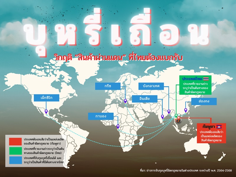 สมาคมการค้ายาสูบไทยเรียกร้องรัฐบาลแก้ไขปัญหาสินค้าบุหรี่ผ่านแดน หลังกรมศุลกากรจับบุหรี่ปลอมจากกัมพูชาในไทยเกือบ 20 ล้านมวน ซึ่งมีปลายทางไปเม็กซิโก สะท้อนความเสี่ยงที่ไทยอาจถูกมองเป็นแหล่งส่งออกบุหรี่ผิดกฎหมายระดับโลก