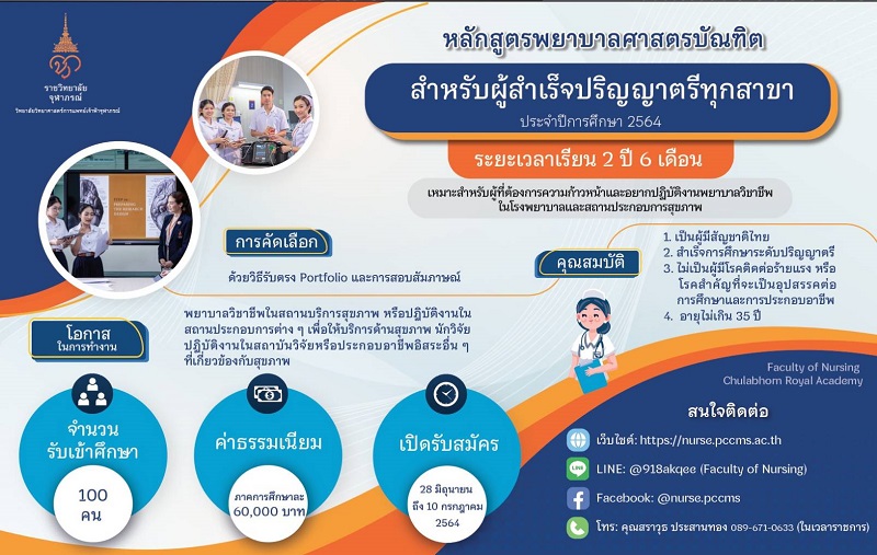 ราชวิทยาลัยจุฬาภรณ์ เปิดหลักสูตรใหม่ ปริญญาตรี-ขยายโอกาส “พยาบาลศาสตรบัณฑิต”รับผู้สำเร็จการศึกษาระดับปริญญาตรีทุกสาขา เรียน 5 เทอม รองรับวิชาชีพขาดแคลน