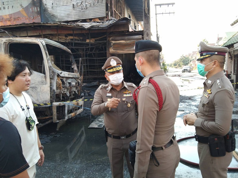 ผู้การปทุมธานี ตรวจเหตุไฟไหม้ร้านอะไหล่ยนต์ วอด 3 คูหา อ.ลำลูกกา