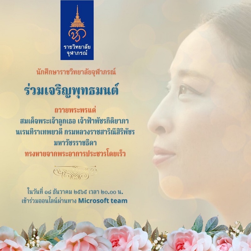 18 ธันวาคม 2565 เวลา 20.00 น. สโมสรนักศึอ่านเพิ่มเติม “นักศึกษาราชวิทยาลัยจุฬาภรณ์ร่วมสวดมนต์ อธิษฐานจิตถวายพระพรให้ “เจ้าฟ้าพัชรกิติยาภา” ทรงหายจากพระอาการประชวร”