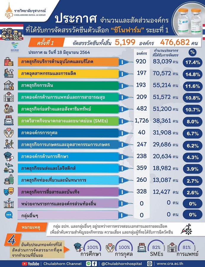 ประกาศการจัดสรรวัคซีนตัวเลือก ซิโนฟาร์ม ให้กับองค์กรและบริษัทที่ยื่นความประสงค์เข้ามาตามประเภทธุรกิจ และพื้นที่ความเสี่ยง