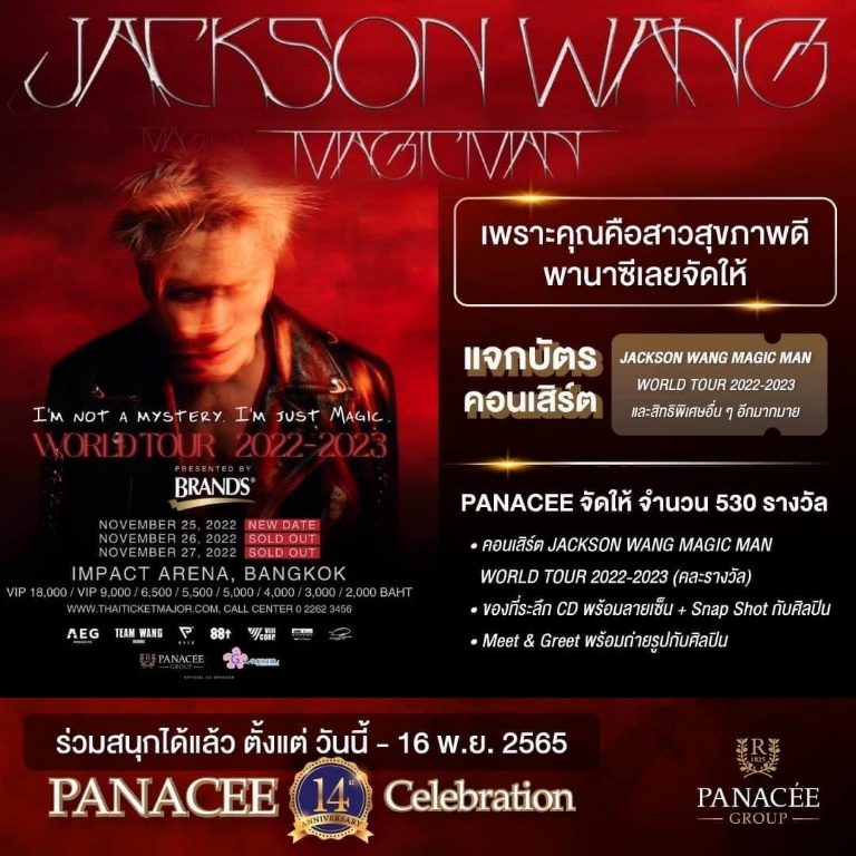 Panacee ฉลองครบรอบ 14 ปี ร่วมสนับสนุน งานคอนเสิร์ต ‘JACKSON WANG MAGIC MAN WORLD TOUR 2022 – 2023’ ลุ้นรับบัตรเข้าชมคอนเสิร์ต – Meet&Greet และอัลบั้มพร้อมลายเซ็นของ Jackson Wang เริ่มลุ้นครั้งแรก 31 ตค.นี้