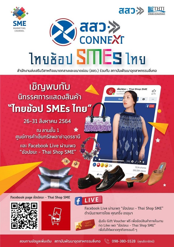 สำนักงานส่งเสริมวิสาหกิจขนาดกลางและขนาดย่อม (สสว.) ร่วมกับ สถาบันพัฒนาอุตสาหกรรมสิ่งทอ ขอเชิญเที่ยวงาน “ไทยช้อป SME ไทย” รวมดีลเด็ด สินค้าดี ราคาโดน จากผู้ประกอบการ SMEs 105 ร้านค้า